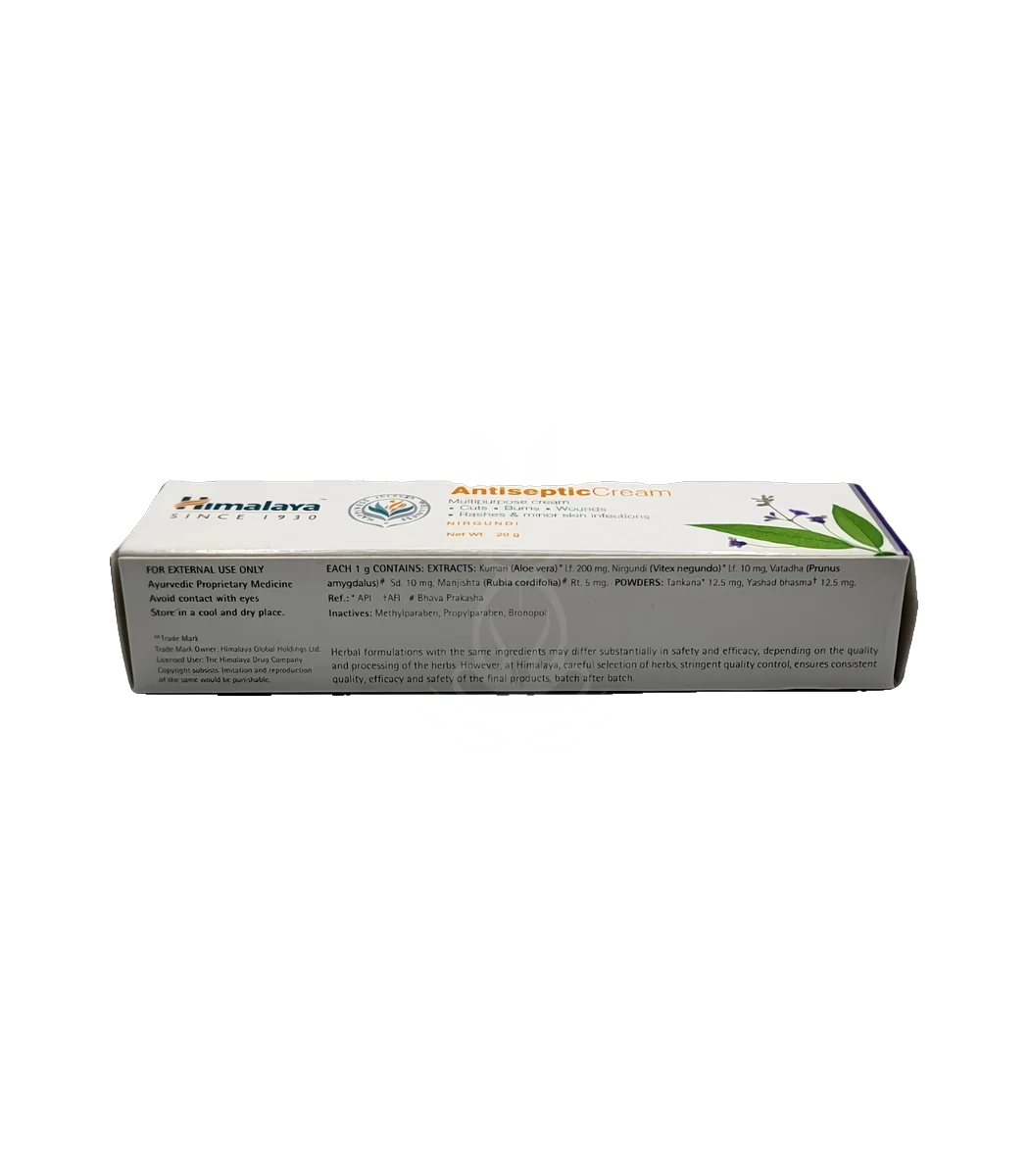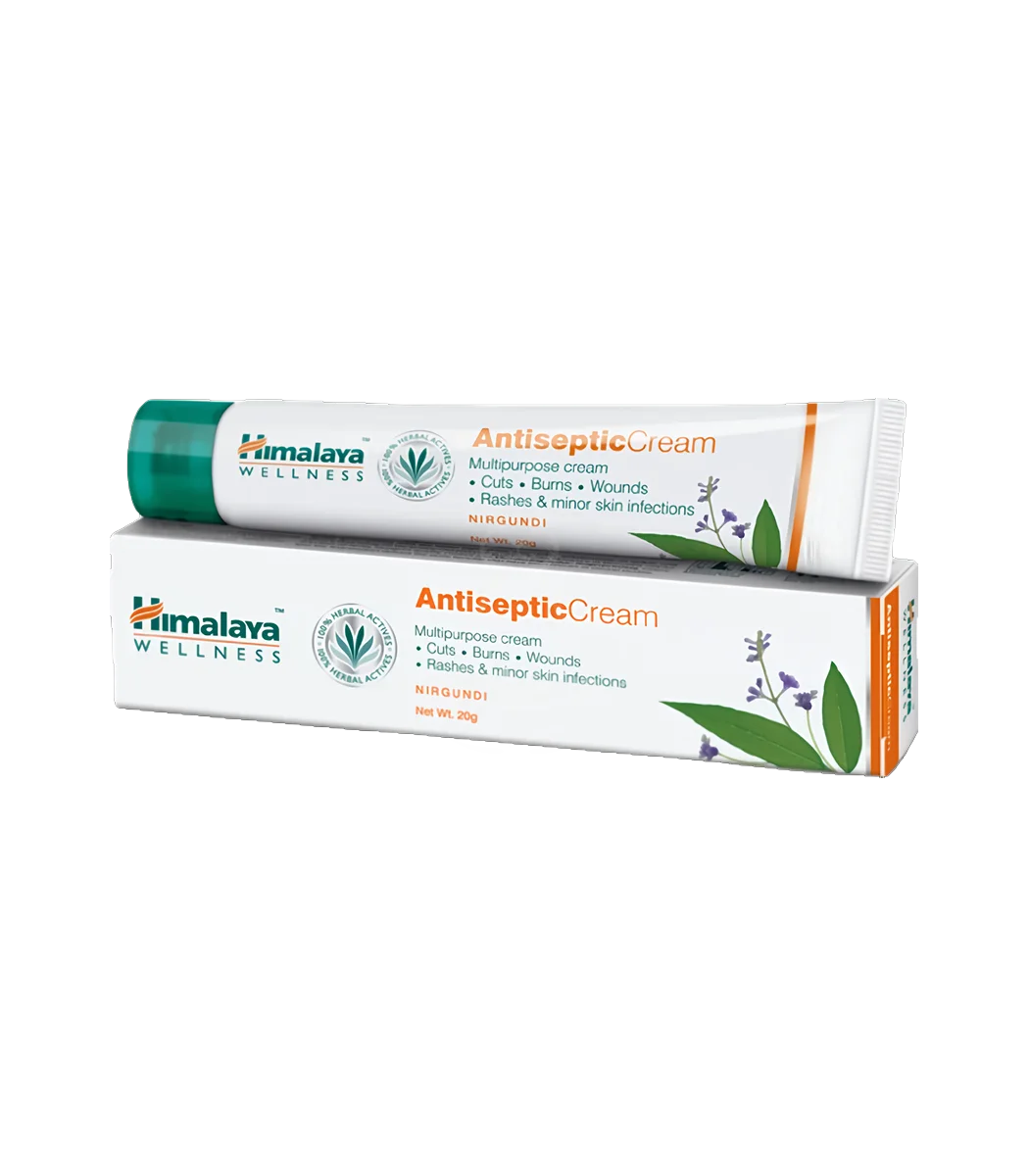 Himalaya Antiseptic Cream — мультифункціональний аюрведичний крем для зовнішнього застосування, що прискорює загоєння дрібних порізів, опіків, подразнень і грибкових уражень шкіри. Формула містить рослинні екстракти, які заспокоюють, зволожують і захищають пошкоджену шкіру від інфікування.