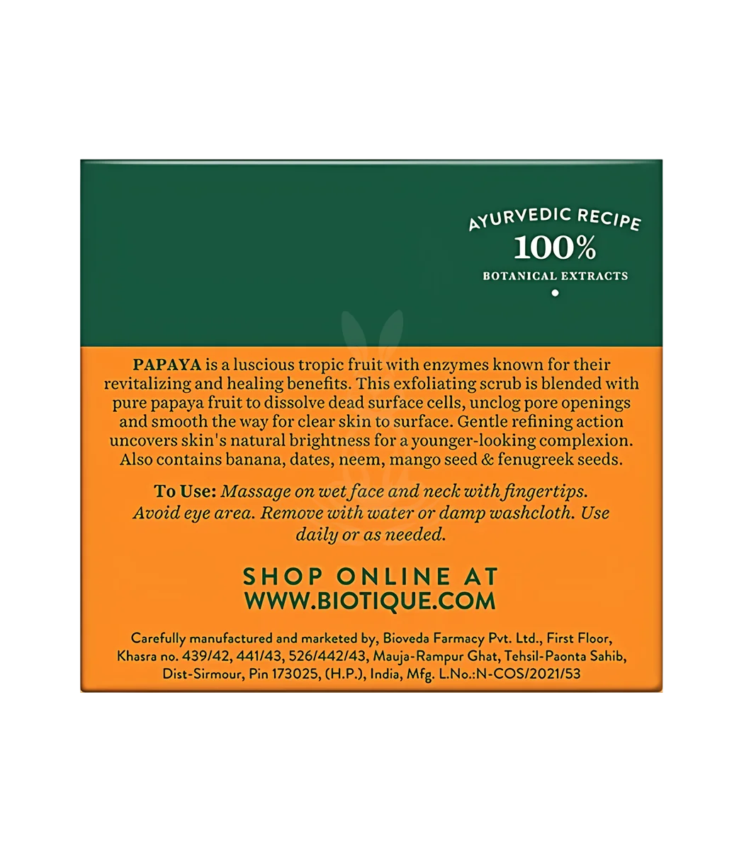 Bio Papaya Scrub від Biotique – це натуральний очищуючий скраб для обличчя на основі папаї, який ефективно відлущує омертвілі клітини шкіри, надаючи їй свіжий та здоровий вигляд. М’яка формула скрабу збагачена рослинними екстрактами, що живлять та зволожують шкіру.