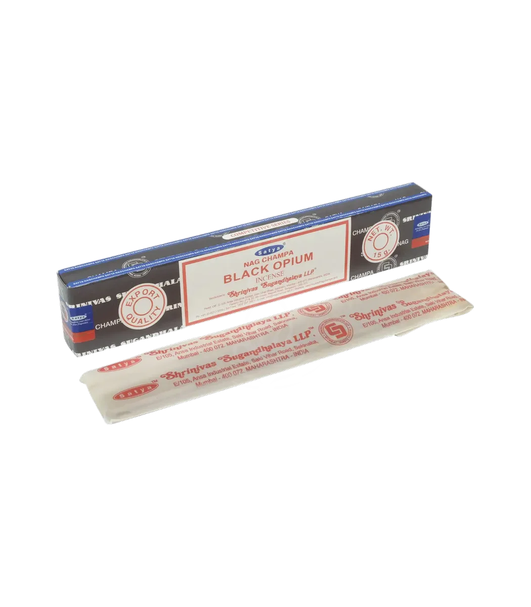 Black Opium від Satya — ароматичні палички (incense sticks) з насиченим східно-утинним ароматом. Виготовлені традиційним масала-методом, підходять для медитації, йоги, очищення простору та створення затишної атмосфери в домі.
