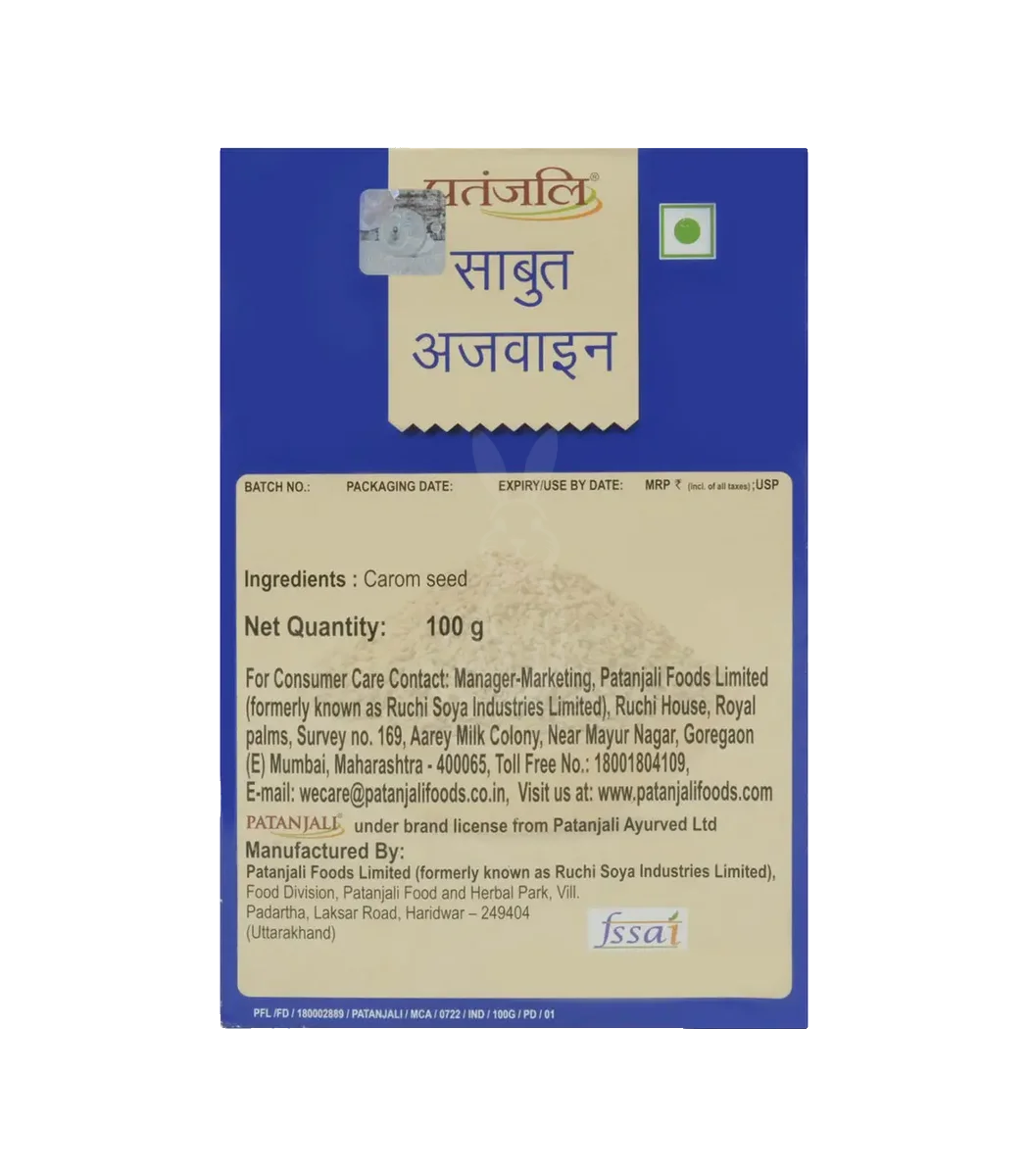 Carom Seeds Ajwain від Patanjali – це високоякісний продукт, який використовується в кулінарії та народній медицині. Аджвайн має сильний аромат і властивості, що сприяють поліпшенню травлення, зменшенню здуття живота та полегшенню симптомів застуди.
