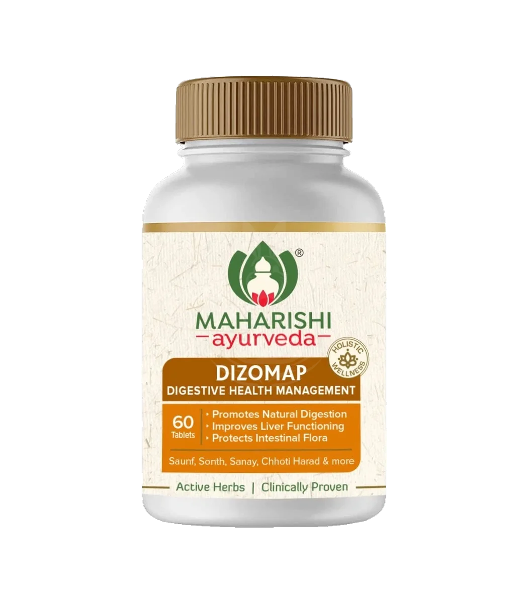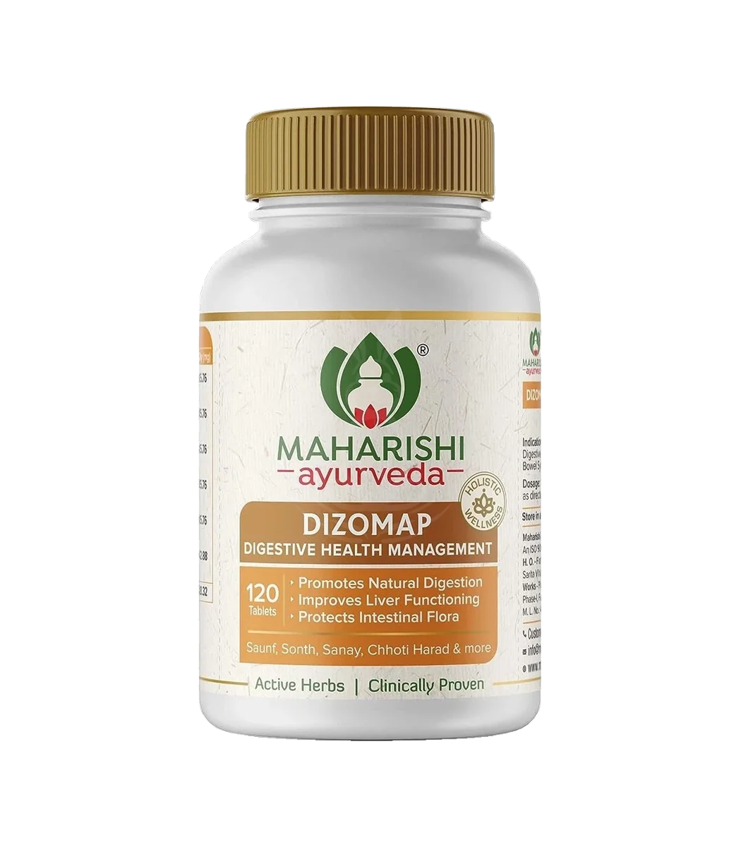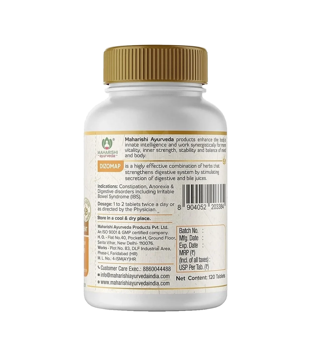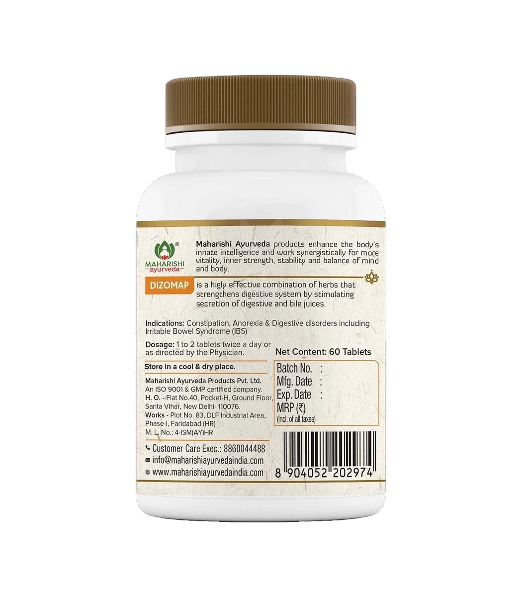 Dizomap від Maharishi — аюрведична таблетована формула для підтримки травлення та нормалізації роботи кишечнику. Препарат поєднує класичні трави та білами (bhasma), які відновлюють травний «агні», сприяють усуненню запорів, відновленню мікрофлори та покращенню апетиту.