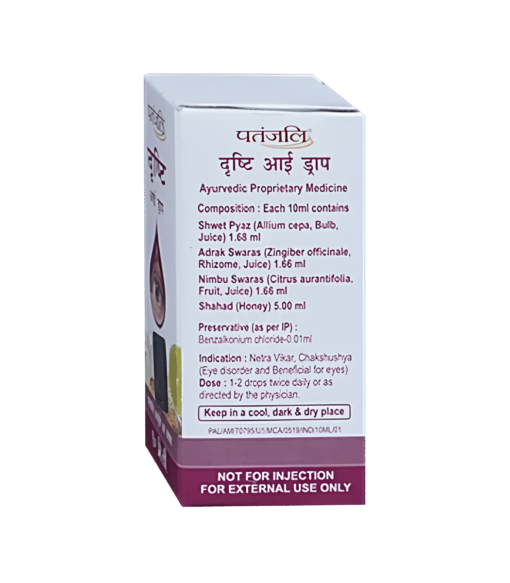 Drishti від Patanjali — аюрведичні очні краплі, які застосовуються для підтримки зору, зменшення втоми очей та поліпшення загального стану зорової системи. Формула містить рослинні екстракти, традиційно використовувані в аюрведі для догляду за очима.