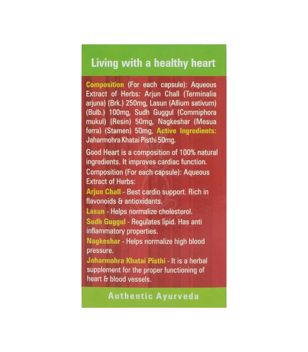 Good Heart – це аюрведичний засіб створений для підтримки та покращення роботи серцево-судинної системи. Завдяки своєму складу, він допомагає знижувати рівень холестерину, покращувати кровообіг та підтримувати здоровий тиск.