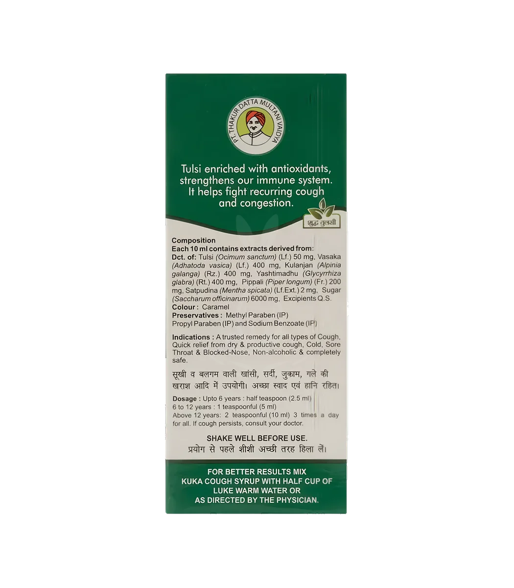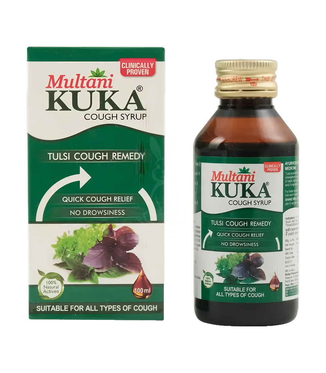 Kuka Syrup від Multani Pharmaceuticals – це аюрведичний сироп, створений для полегшення симптомів кашлю та застуди. Формула містить натуральні компоненти, які допомагають зменшити кашель, полегшити дихання та підтримати загальне здоров’я дихальної системи.