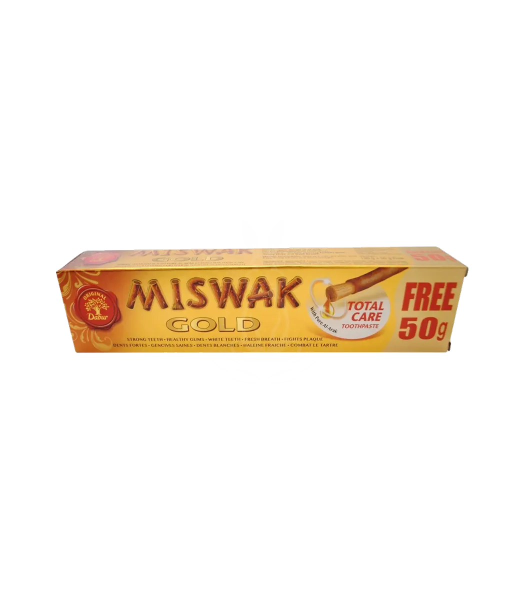 Miswak Gold від Dabur – це зубна паста, яка містить екстракт мисваку, відомого своїми антибактеріальними та протизапальними властивостями. Паста сприяє ретельному очищенню ротової порожнини, зміцненню ясен та наданню подиху свіжості.