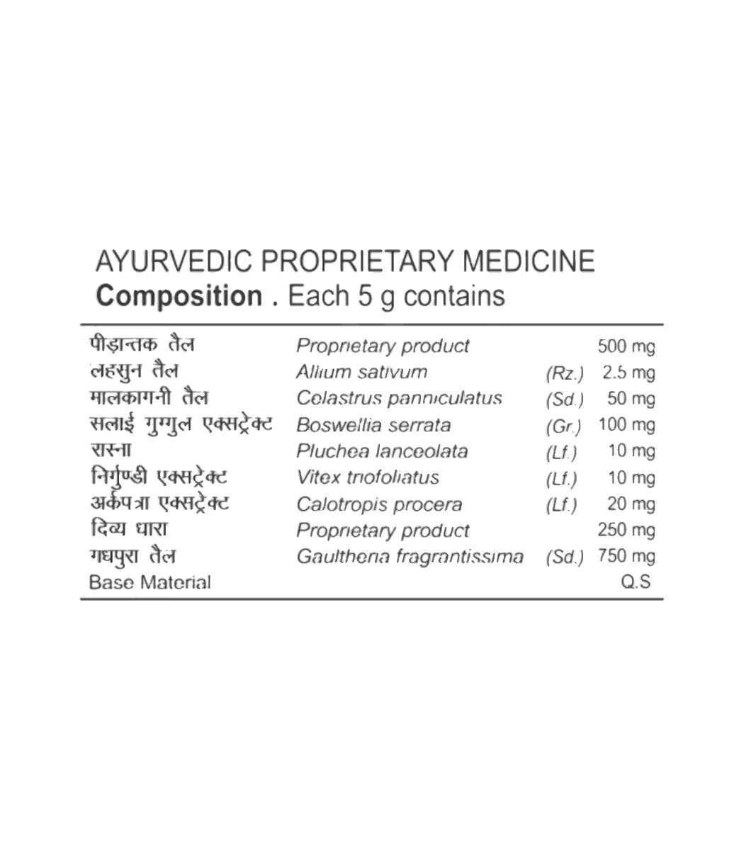 Peedantak (Peddantak) від Patanjali — аюрведична знеболювальна мазь для зовнішнього застосування, призначена для місцевого полегшення м’язового та суглобового болю. Натуральні інгредієнти сприяють покращенню кровообігу в ділянці нанесення, знімають запалення, спазми та набряк, забезпечують відчуття тепла й полегшують рухливість.