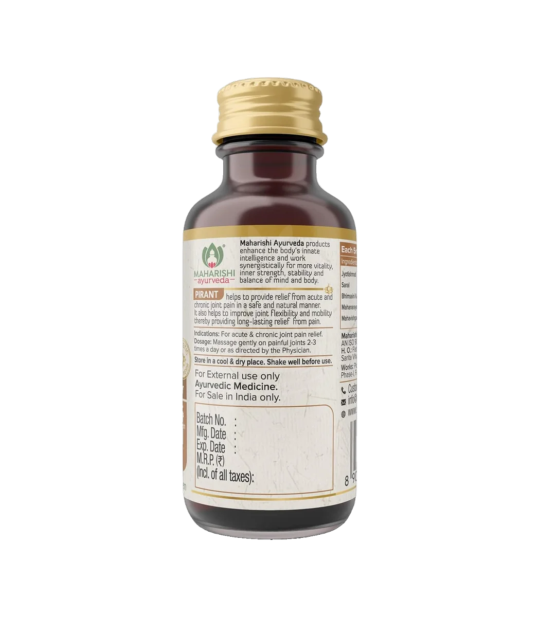 Pirant Oil від Maharishi — аюрведична масляна формула для зовнішнього застосування, розроблена для полегшення болю в м’язах і суглобах, зменшення запалення та зняття скутості. До складу входять традиційні лікувальні олії (Mahanarayan, Mahavishgarbh та ін.), які забезпечують розігріваючий та протизапальний ефекти при місцевому масажі.