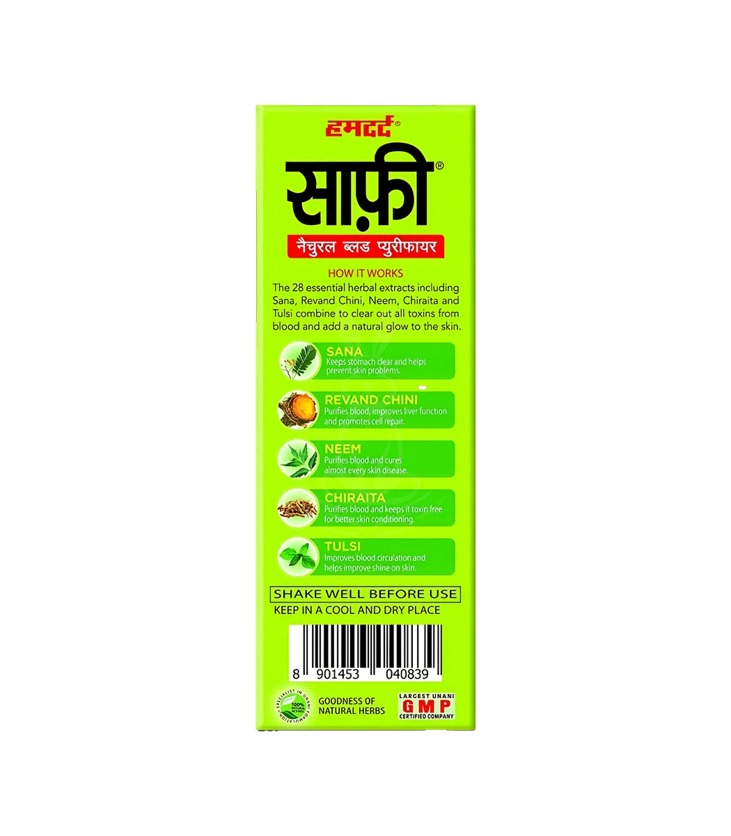 Safi Syrup від Hamdard – це популярний аюрведичний засіб для очищення крові та підтримки здоров’я шкіри. Збагачений природними травами, цей сироп сприяє виведенню токсинів з організму та покращенню загального самопочуття.