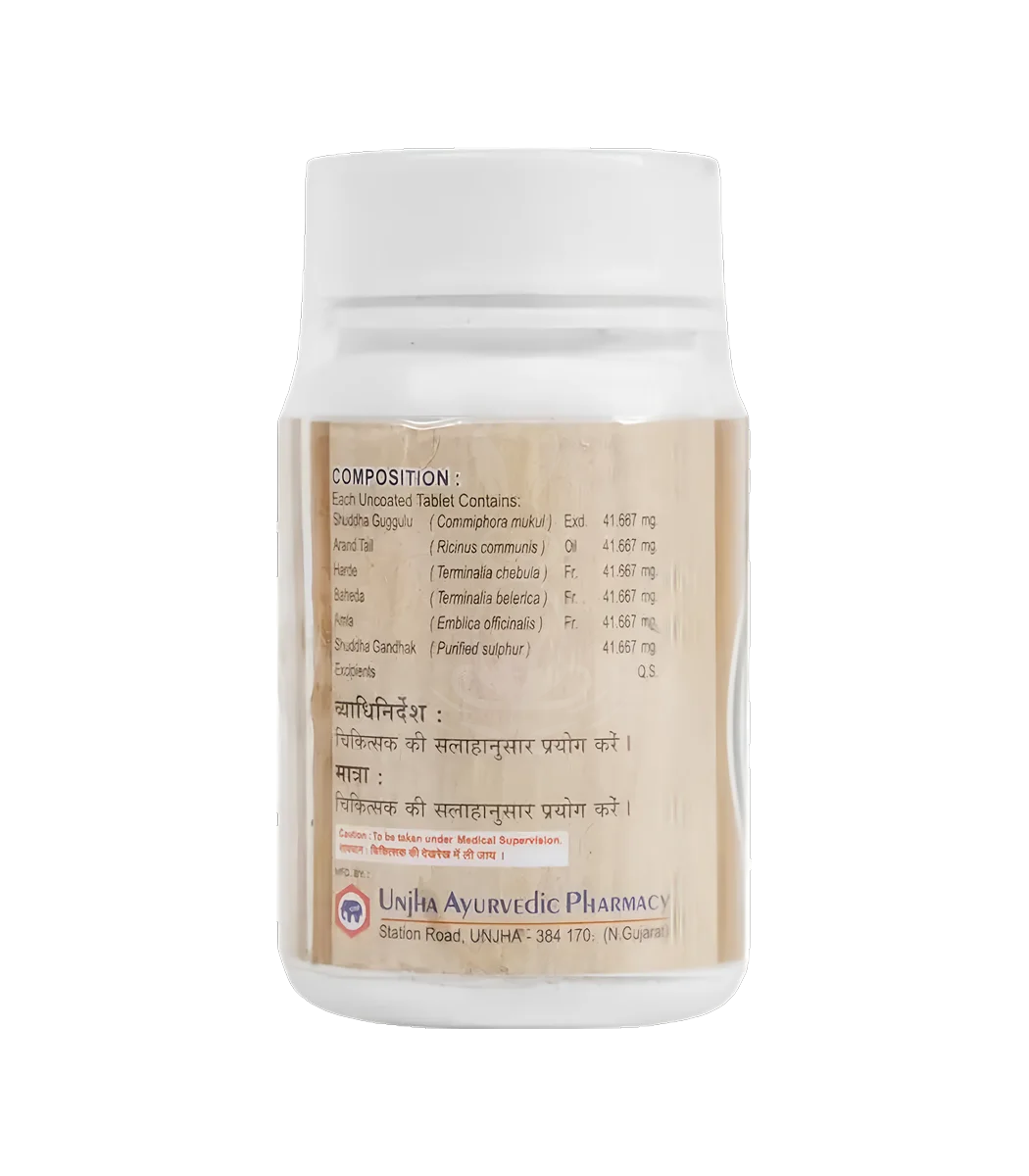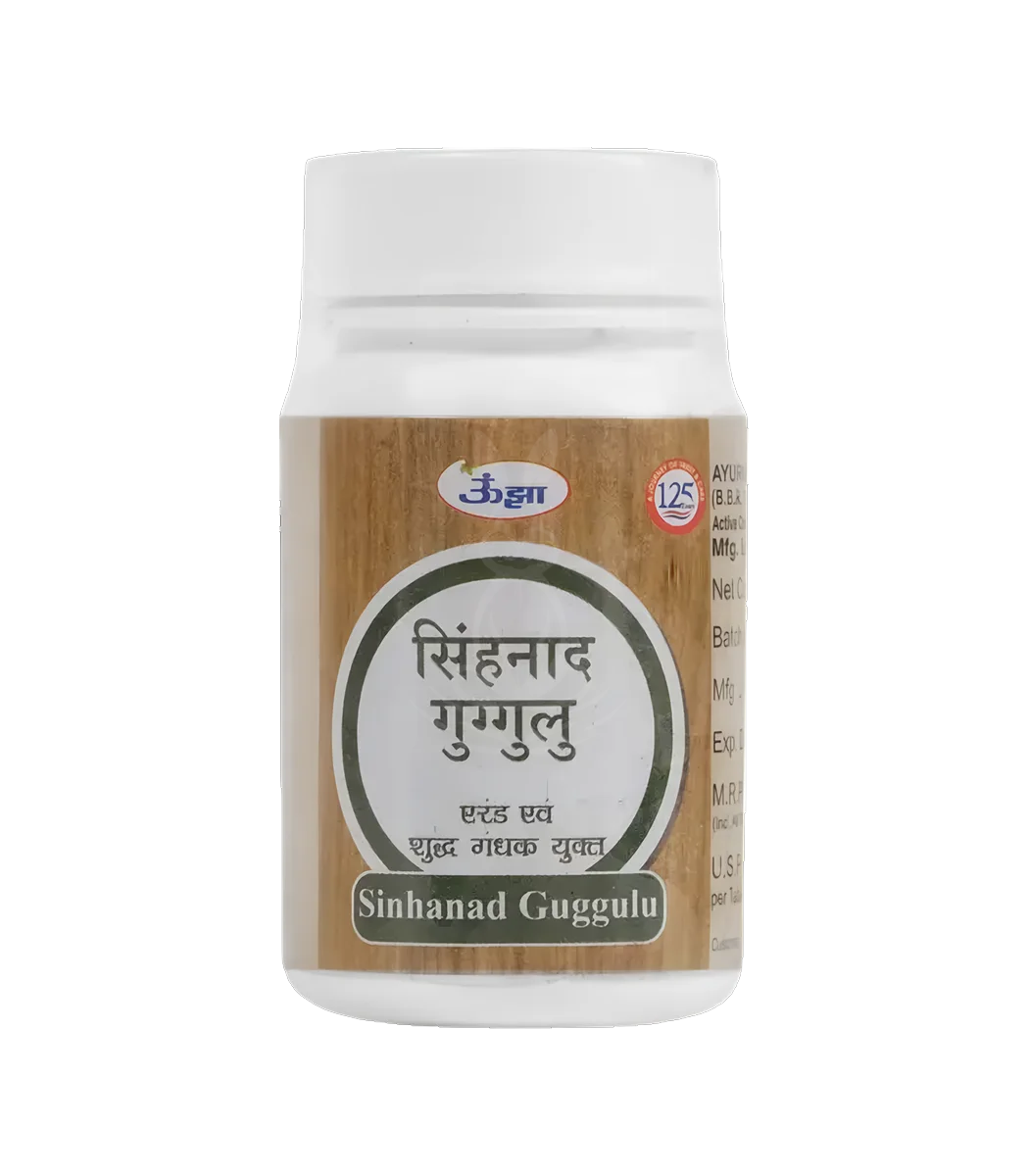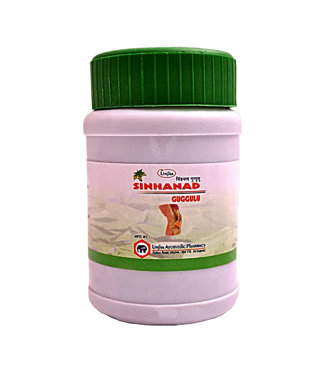Sinhnady Guggul від Unjha — традиційний аюрведичний препарат на основі гуггулу, призначений для підтримки опорно-рухової системи, зменшення запалення та сприяння виведенню токсинів із організму. Використовується при болях у суглобах, артритах, підвищеному капха/вата дисбалансі та для загальної детоксикації.