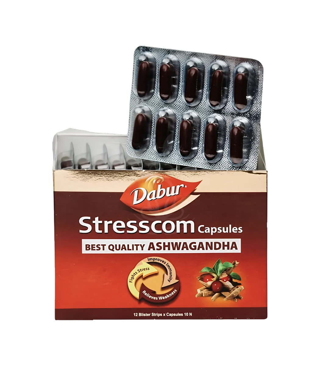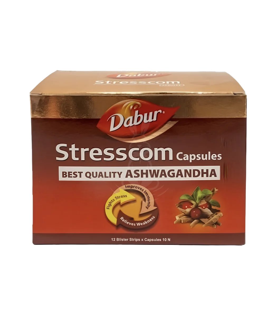 Stresscom від Dabur — аюрведична капсульована формула на основі екстракту кореня ашваганди, розроблена для зниження стресу, підвищення витривалості та покращення загального тонусу організму. Препарат діє як адаптоген, підтримує нервову систему та імунітет.