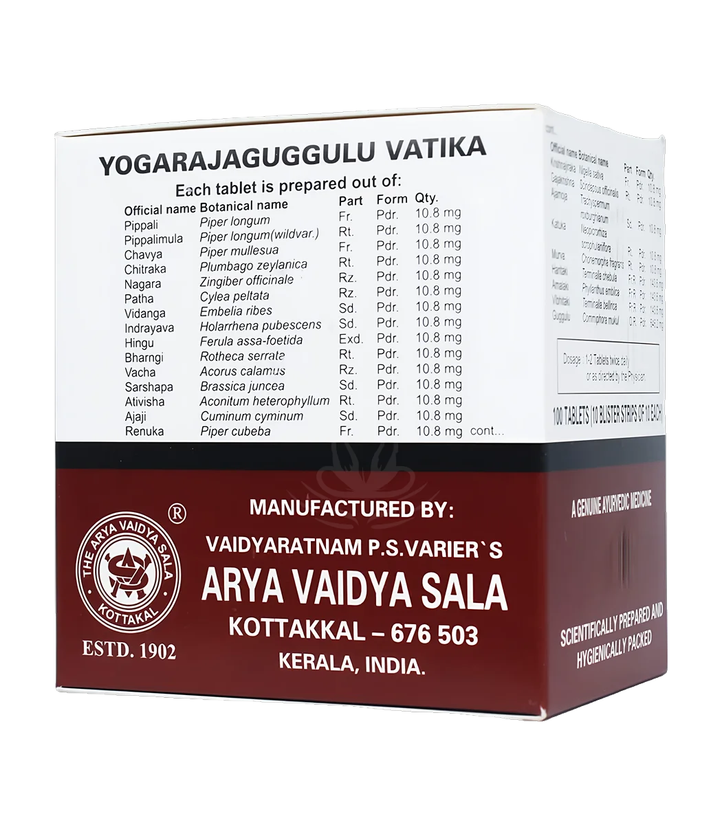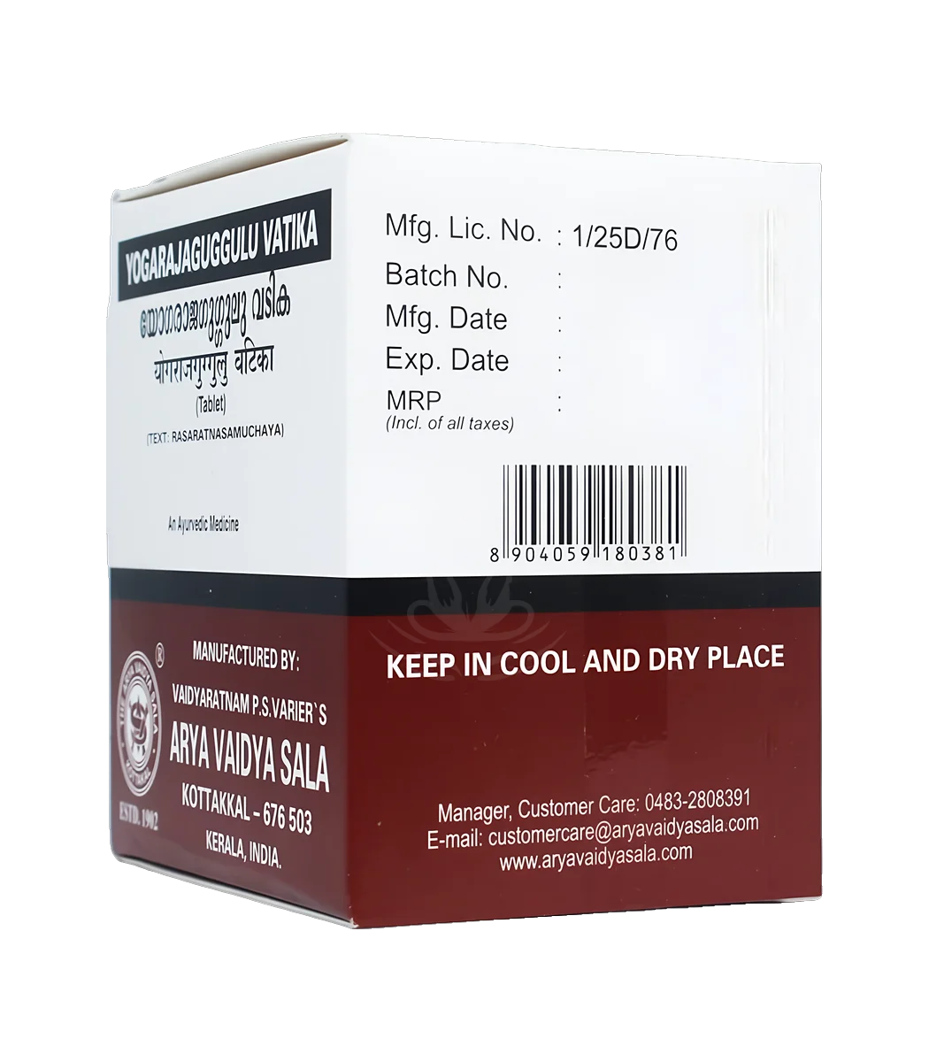 Yograj Guggulu від AVS – це традиційний аюрведичний препарат, відомий своєю ефективністю у підтримці здоров’я суглобів і м’язів. Він допомагає зняти запалення, зменшити біль у суглобах та покращити гнучкість тіла. Призначається для полегшення стану при артриті і розладах опорно-рухової системи.